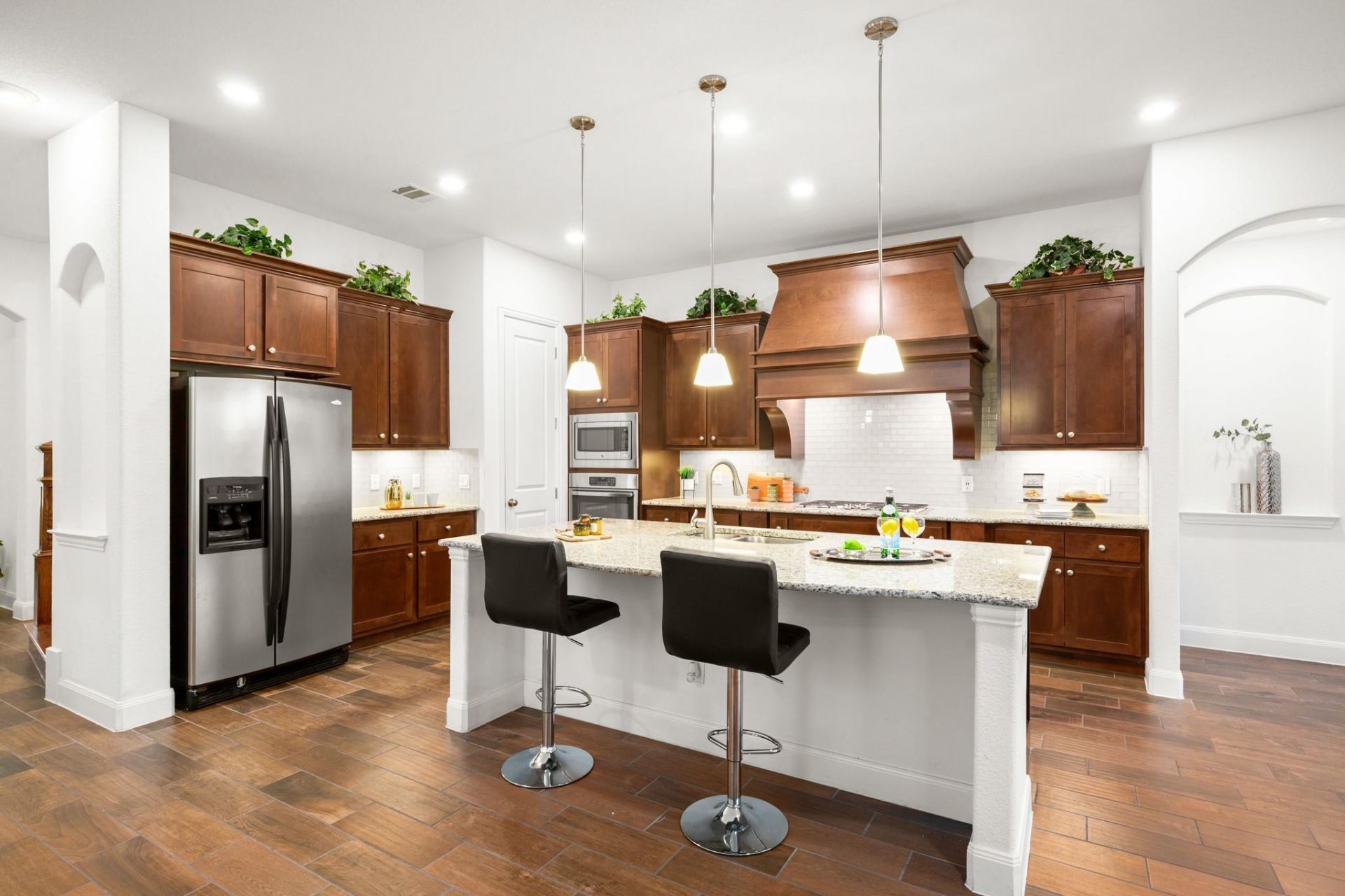 1.5-story home designed for flexibility, with most daily living on the main level and a private upstairs retreat. Four bedrooms, including the primary suite, are positioned downstairs, allowing for a practical layout that keeps everyday routines accessible while maintaining separation where it matters.The kitchen anchors the home with a large island, granite surfaces, and a direct connection to the dining and living areas, creating a natural flow for both daily use and small gatherings. The living room centers around a fireplace and transitions easily to the covered patio, extending the usable space outdoors.The primary suite is set apart for privacy and includes a spacious bath with dual vanities, soaking tub, separate shower, and a walk-in closet designed for real storage needs. Secondary bedrooms offer flexibility for guests, office space, or hobbies.Upstairs, a game room, bedroom, and full bath provide a separate zone that works well for guests or multi-purpose use.The oversized covered patio offers a shaded outdoor setting overlooking a level backyard. Additional features include a 3-car garage with EV charger and expanded storage, including a secondary attic access with added door and decking for improved usability.Community amenities include a pool, playscape, and covered seating area.