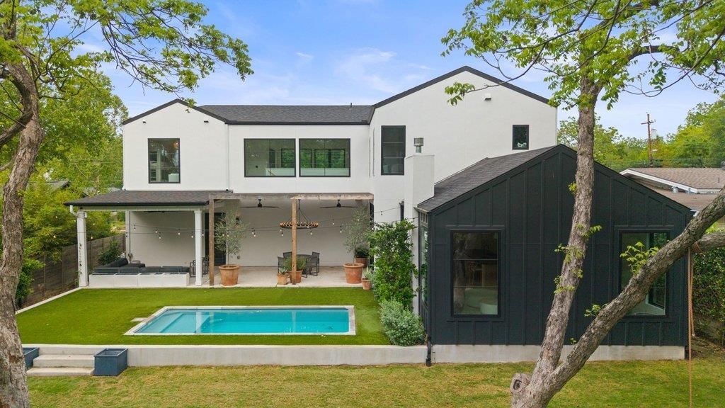 A refined expression of modern architecture in the heart of Brentwood, this thoughtfully designed residence is the result of a collaborative vision between Rodenberg Design, SLIC Design, and Narum Design Build, delivering a level of craftsmanship and intentionality rarely seen at this price point. Clean lines and curated finishes define the interiors, where white oak flooring runs throughout, complemented by high-end Benchmark custom cabinetry, matte black hardware, stainless steel Thermador appliances, and striking Basaltina stone island countertops and backsplash that anchor the kitchen with a sophisticated, textural edge. A Lutron smart lighting system enhances both ambiance and functionality, while expansive windows flood the home with natural light and a fluid layout offers both everyday livability and elevated entertaining, including a secondary living space for added flexibility. The exterior is equally considered, featuring a sleek black metal roof and a private backyard retreat anchored by a generous covered living space with custom chandelier detail, a pool framed by turf and irrigation, and a beautifully tiered, wide-use yard lined with meticulously installed Eagleton holly hedging for privacy. Every element has been intentionally curated, resulting in a residence that feels both architecturally significant and effortlessly livable, all within one of Central Austins most sought-after neighborhoods. Ideally positioned just minutes from Downtown Austin, with convenient access to Mopac and 183, the home offers seamless connectivity while keeping you close to the citys best dining, retail, and entertainment.